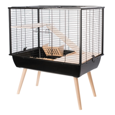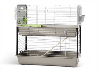 Knaagdierkooi Caesar 3 Dubbel Een dubbele knaagdierkooi met modern design. De toplaag bevat twee plastic zijpanelen met geïntegreerde voerbak, drinkfles en hooi / groenten rekje. Een houten trapje zorgt voor de verbinding tussen het boven- en onderd